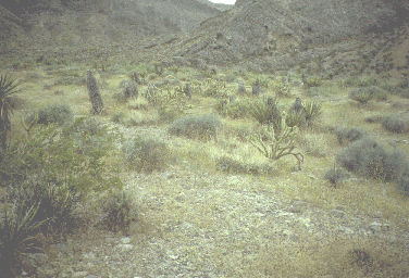 funerea, Larrea tridentata, Yucca schidigera. Mean lichen crust thickness: 13.6 mm Cover summary:Type Cover % Cover Shrubs 0.0 Annuals 7.6 Perennial grasses 0.0 Perennial forbs 0.0 Algal crust 1.2 Bryophytes 4.0 Lichen crust 12.4 Bare Soil 1.2 Rock 29.6 Gravel 42.0 Litter 1.6 Cactus 0.4 Chlorophyll a (ng/g): 9487.80 |